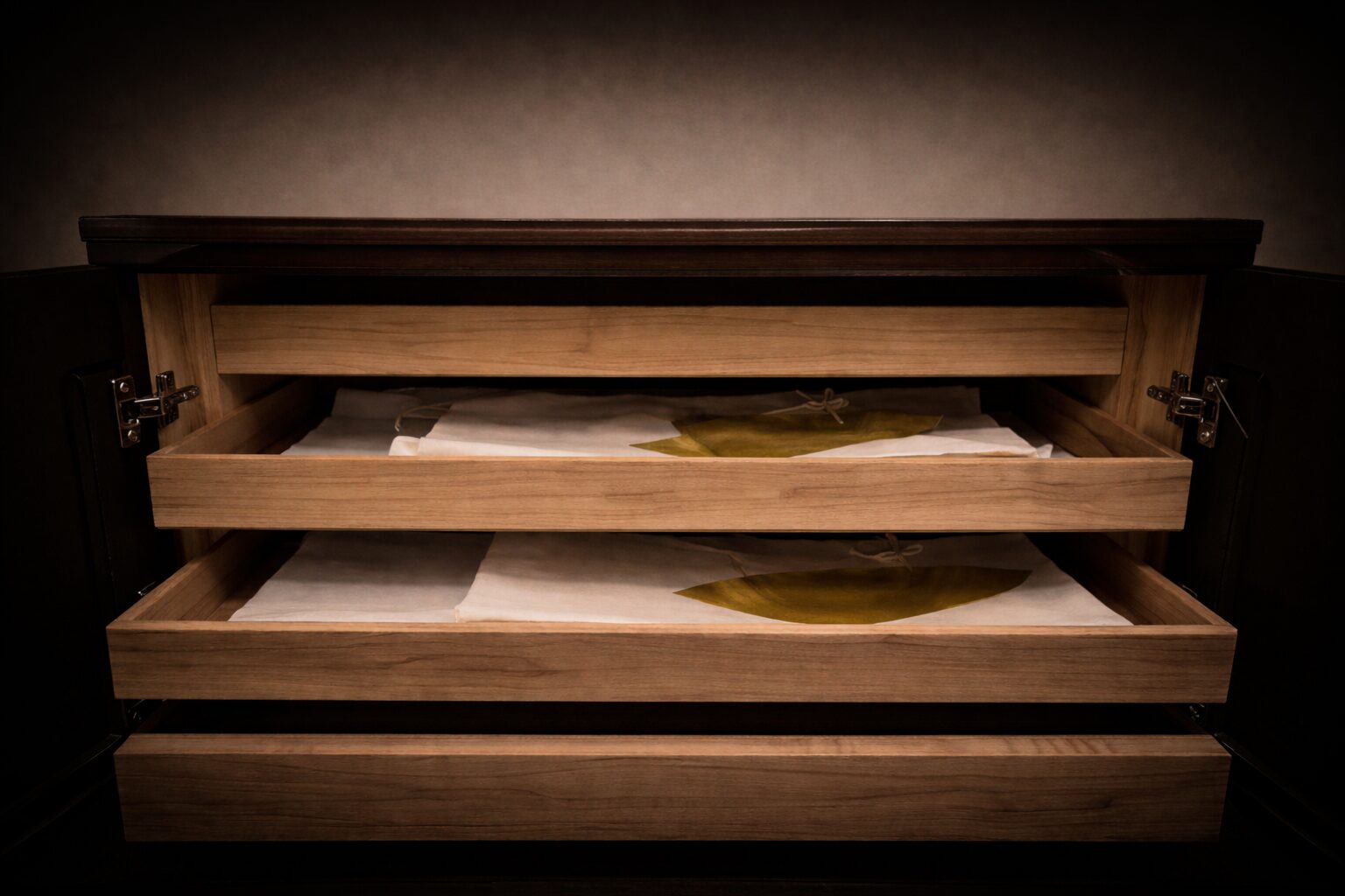 当店の保管サービスは、着物に最適な温度・湿度を24時間体制で徹底管理。契約更新時にはプロの目による「虫干し」も行い、あなたの大切な財産を次世代へつなぐお手伝いをいたします。